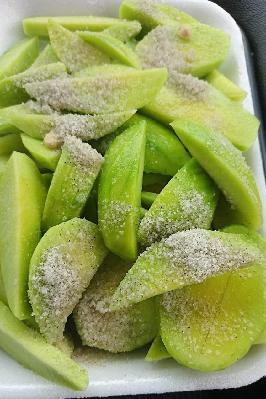Caption: Look the green mangoes, look the salt with spicy.